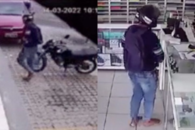 O ladrão estava com a arma na cintura e de moto da cor preta. Ele levou dinheiro da loja e os celulares das funcionárias.
